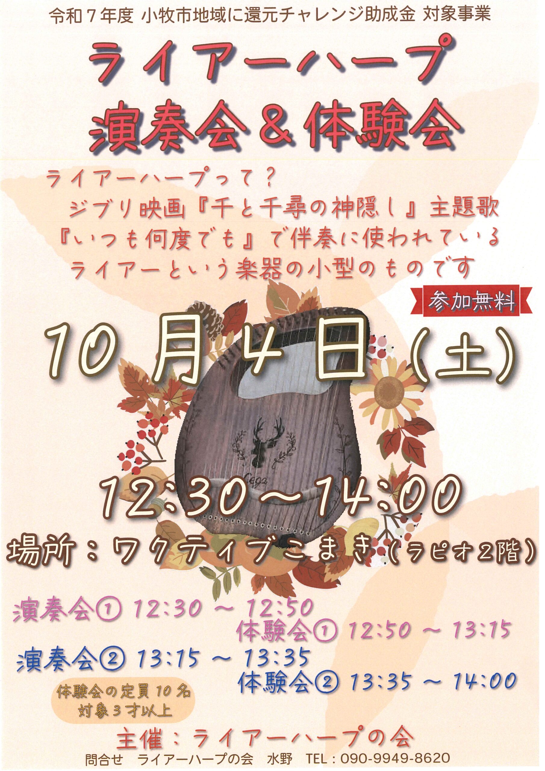 めったに触ることのできないライアーハープの音色を聞きに来ていただき、体験もしたい方はお申込みください。
