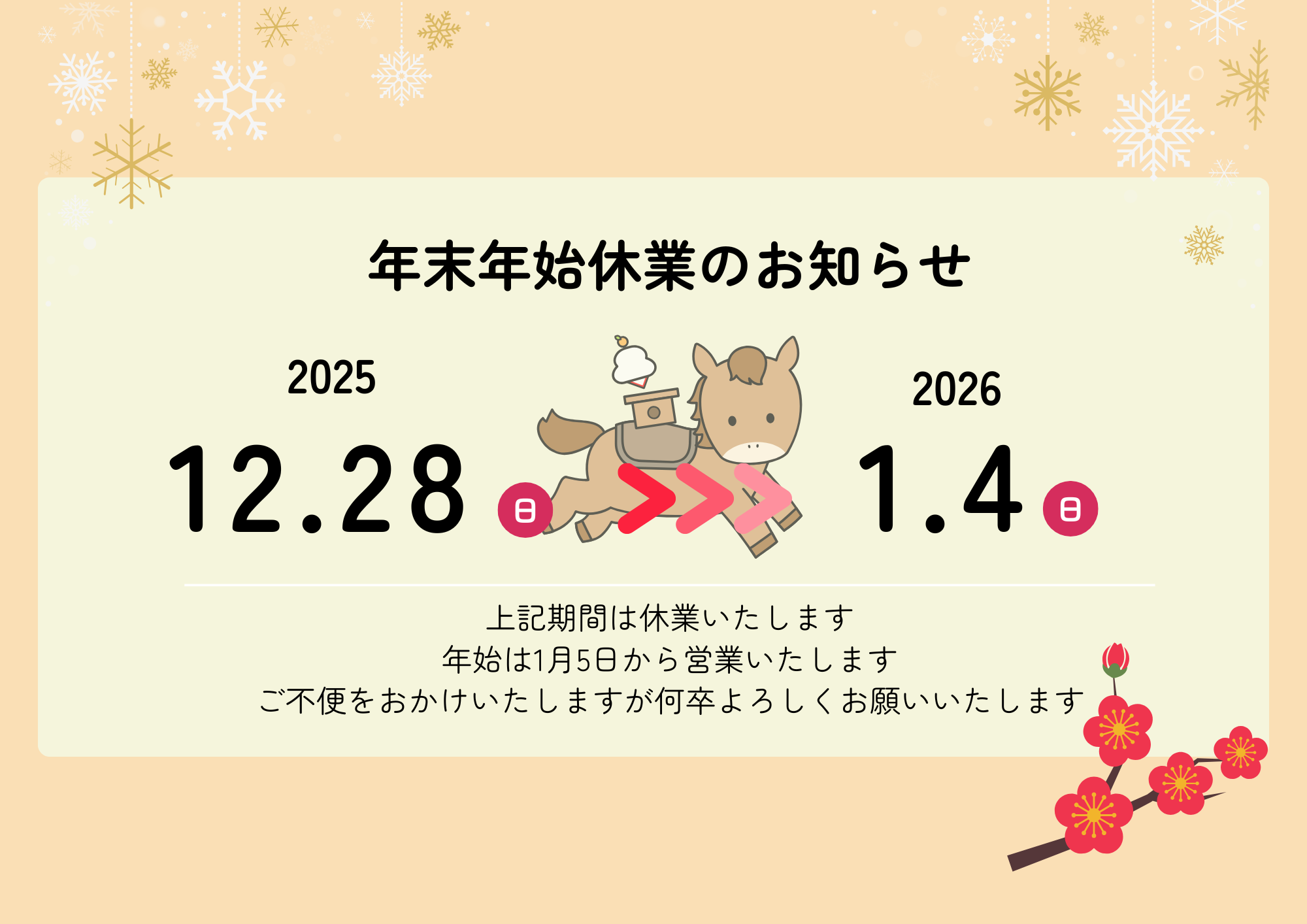 2025年12月28(日)より2026年1月4日(日)までは年末年始休業とさせて頂きます。